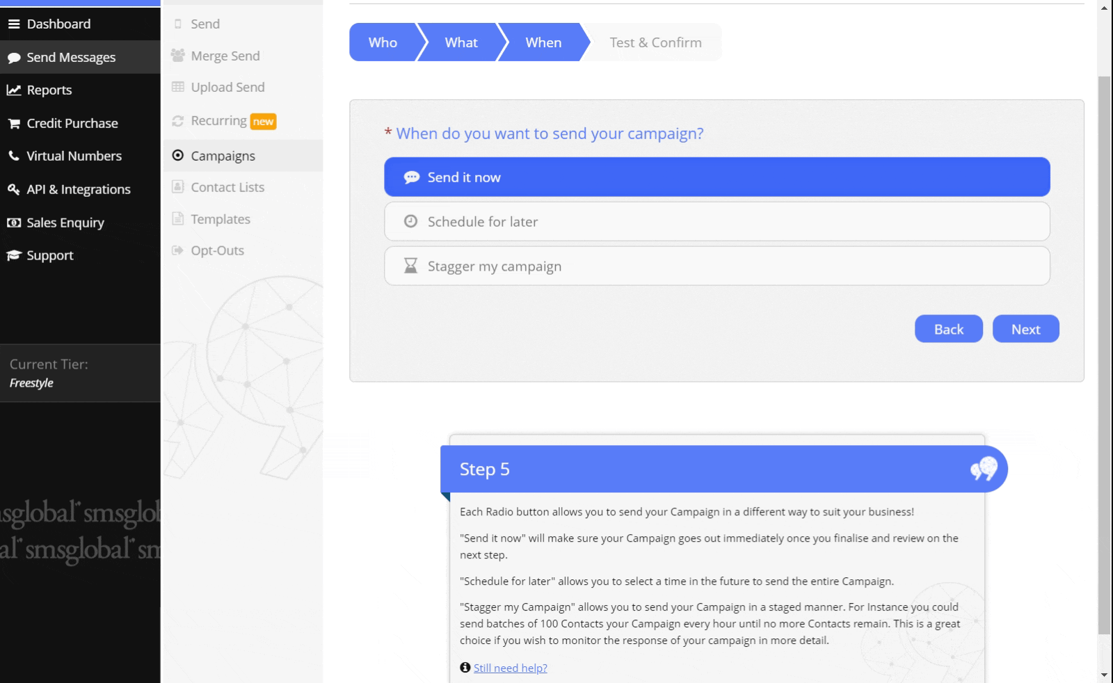 If you would like your SMS campaign to be gradually delivered to your recipients, you can choose to have batches of messages sent out at specific time intervals.