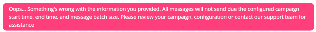 Note: If your chosen 'Batch Size' and 'Time between batches' does not allow for your full contact list to be processed, you will receive the following error to alert you to update the staggering configuration: