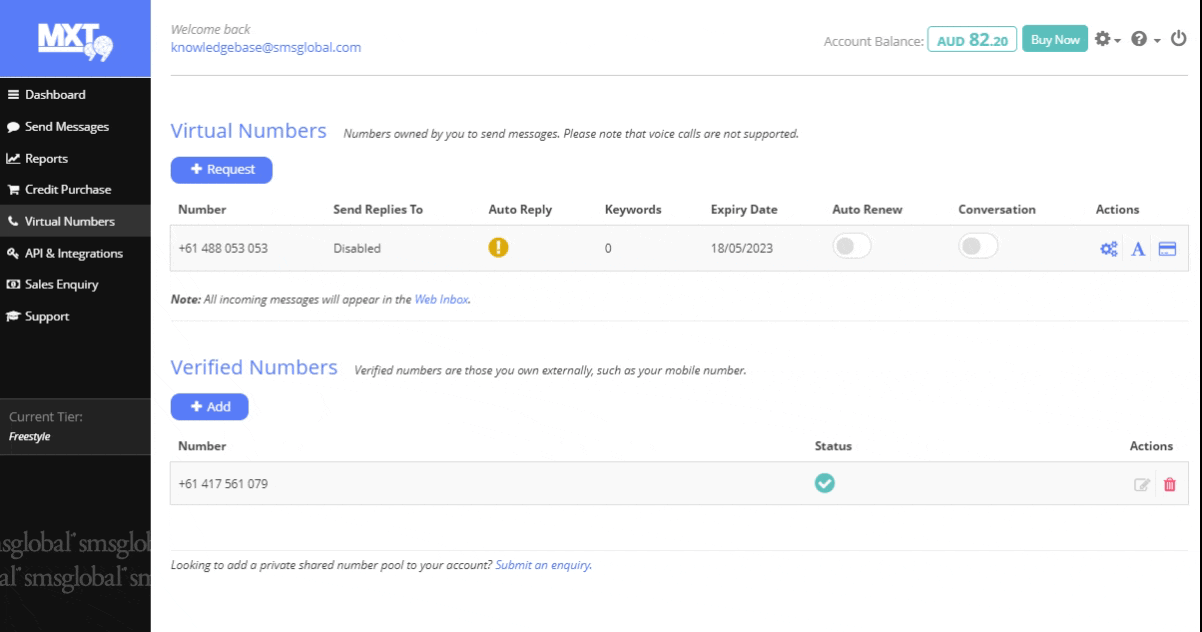 1. Go to the ‘Virtual numbers’ tab on the left-hand side of the MXT Menu.