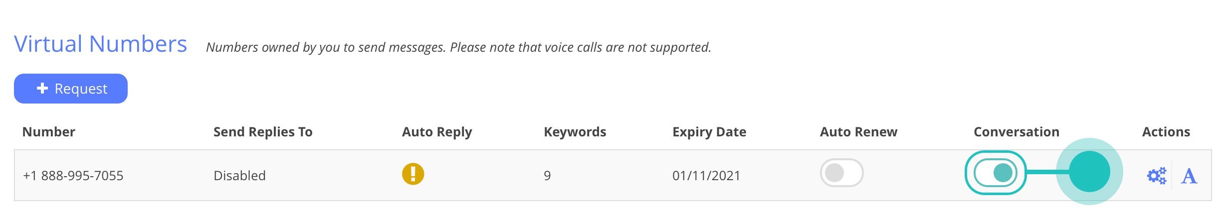 2. Once you own a Virtual Number, you can enable the Conversation feature for that number in the 'Virtual Number' section in MXT.
