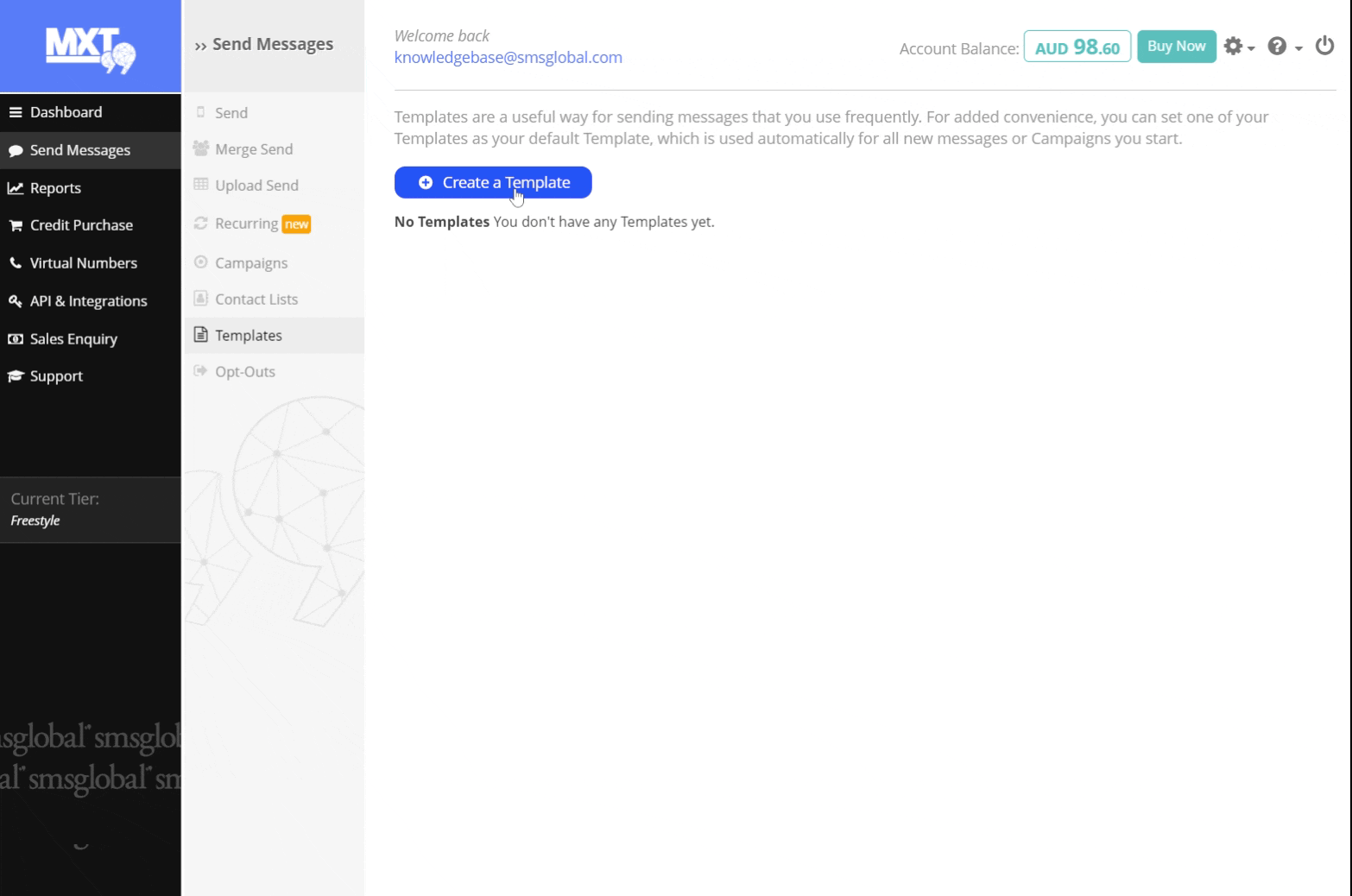1. Select ‘Send Messages’ on the left-hand side of the MXT menu, click on ‘Templates’.