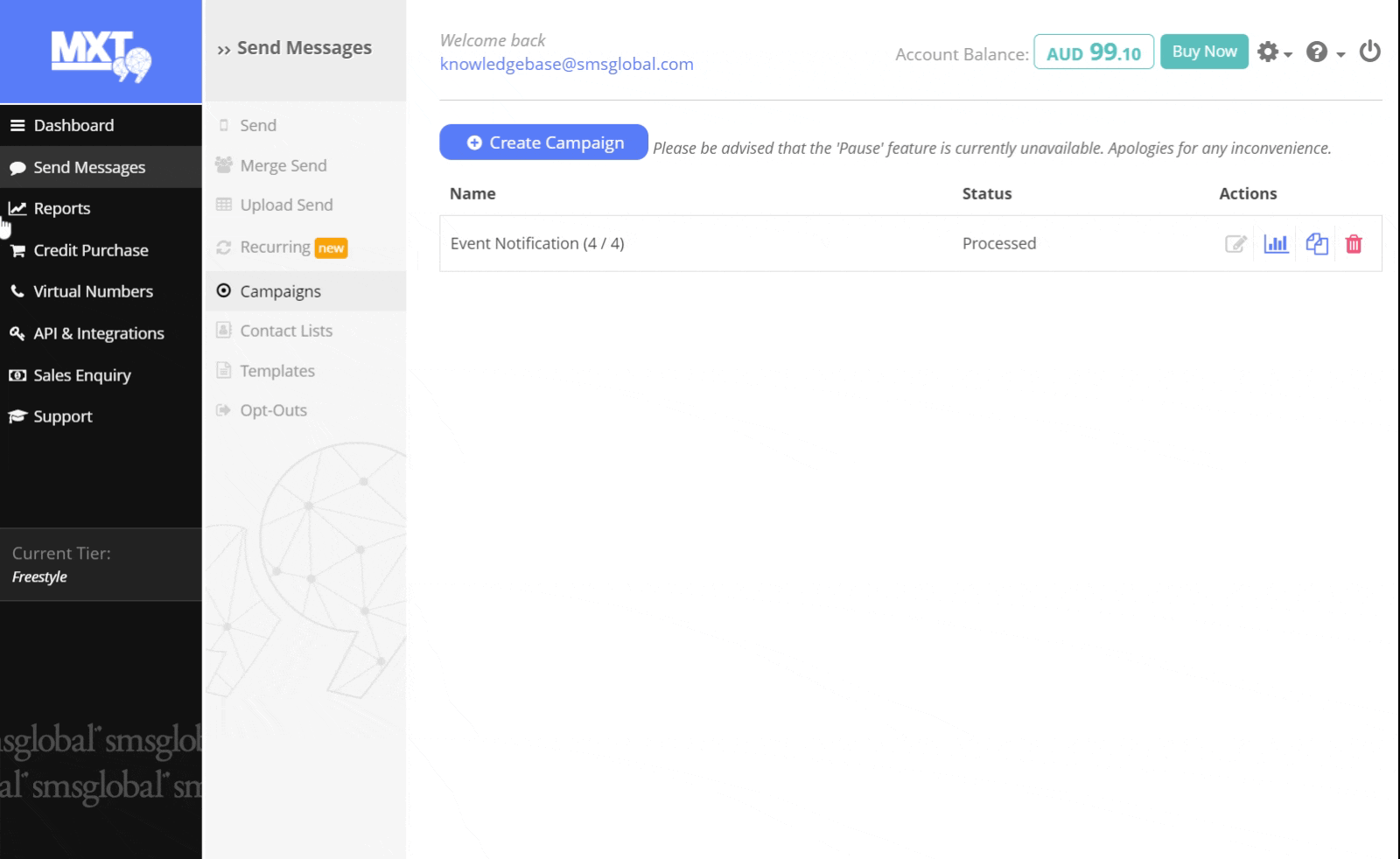 Note: When you delete a campaign, all message history and reports for that campaign will be deleted from MXT. Messages that have not yet been delivered will be cancelled, and any messages that have already been sent may still arrive at recipients' handsets.