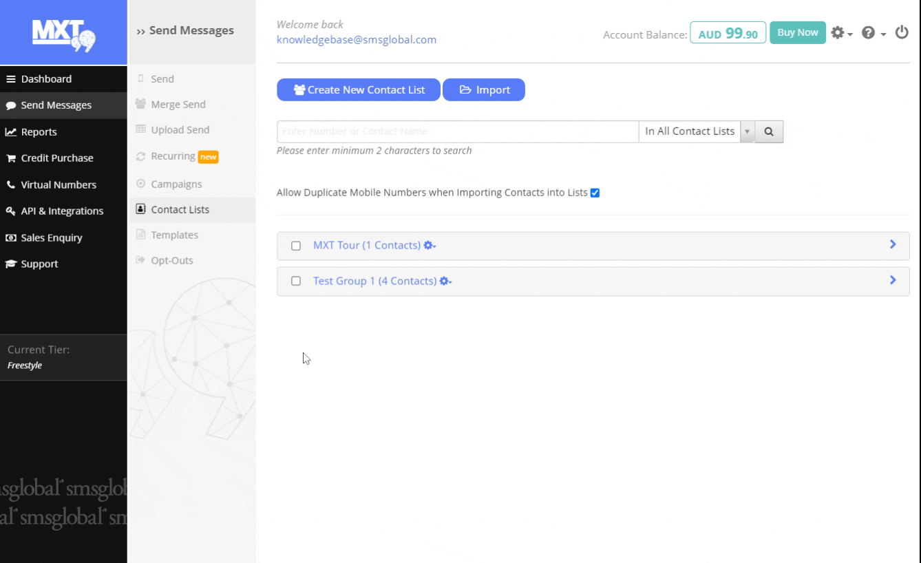 1. Select 'Send Messages' from the left-hand menu of MXT, then select 'Contact Lists'.