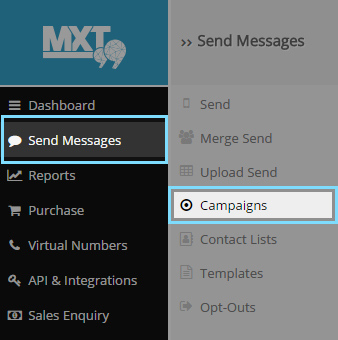 1. Select ‘Send Messages’ on the left-hand side of the MXT menu, then click ‘Campaigns’.