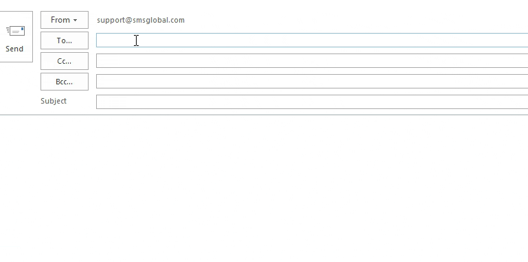 2. Compose a new email, and in the ‘To’ address bar, type: phonenumber@email.smsglobal.com (e.g. 61455533321@email.smsglobal.com).