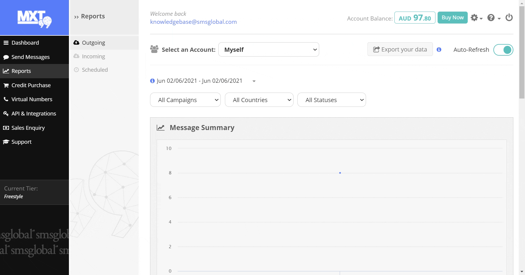 1. Select ‘Reports’ from the left-hand side of the MXT menu, then click on the type of report you would like to view: Outgoing, Incoming or Scheduled.