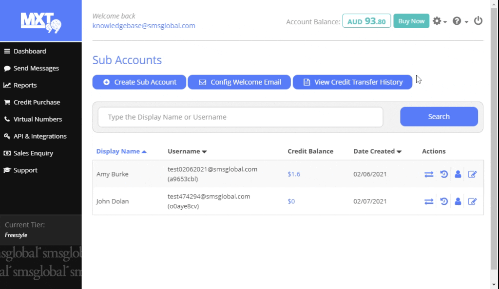 2. Once you have found the Sub Account that you wish to transfer funds to, under the ‘Actions’ heading you will see the 'Transfer Credits' arrow icon. Click on this option.